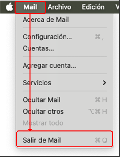 Al terminar la configuración, ir a Mail > Salir de Mail para cerrar la aplicación, esperar unos 10 segundos y abrirla nuevamente.
